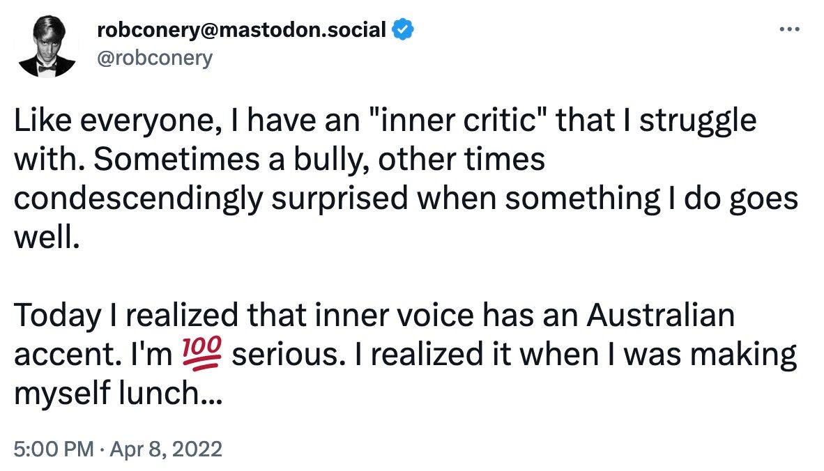 Maybe this is why my inner voice sounds Australian to me (though this last was a bit more Birmingham) - I find it easier to laugh at and ignore.